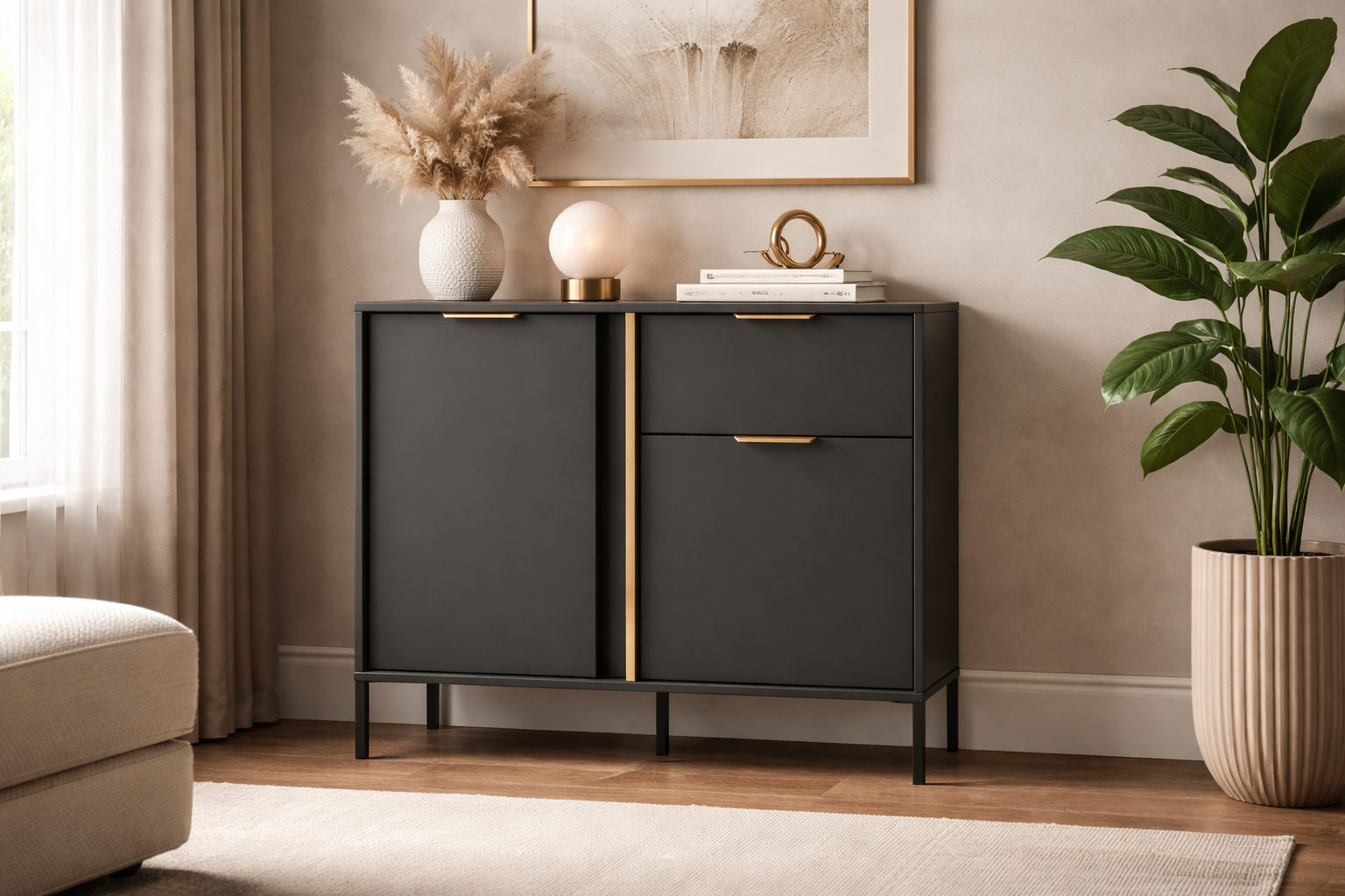 LARS to propozycja dla osób poszukujących mebli, które łączą elegancję z nowoczesnym charakterem. Głęboki antracytowy kolor zyskał wyjątkowe wykończenie dzięki złotym akcentom – subtelnemu obrzeżu ABS na przegrodach oraz stylowym uchwytom. To detale, które podkreślają wyszukany design i dodają kolekcji klasy.