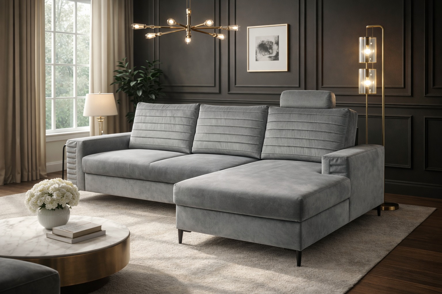 To mebel z funkcją spania, pojemnikiem na pościel oraz wyciąganym zagłówkiem, który zapewnia wygodę i elegancki wygląd. Idealny do każdego wnętrza, łącząc komfort z nowoczesnym designem i praktycznymi rozwiązaniami.