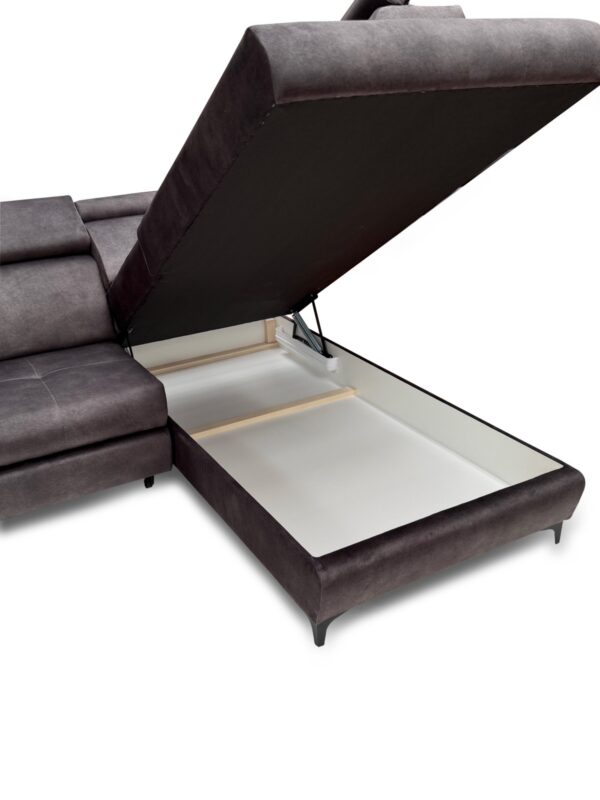 Pod siedziskiem znajduje się pojemny schowek, w którym bez trudu przechowasz pościel, koce czy poduszki, mając je zawsze pod ręką. Narożnik Lukas to idealne rozwiązanie dla osób ceniących wygodę, praktyczność i nowoczesny styl w jednym meblu.