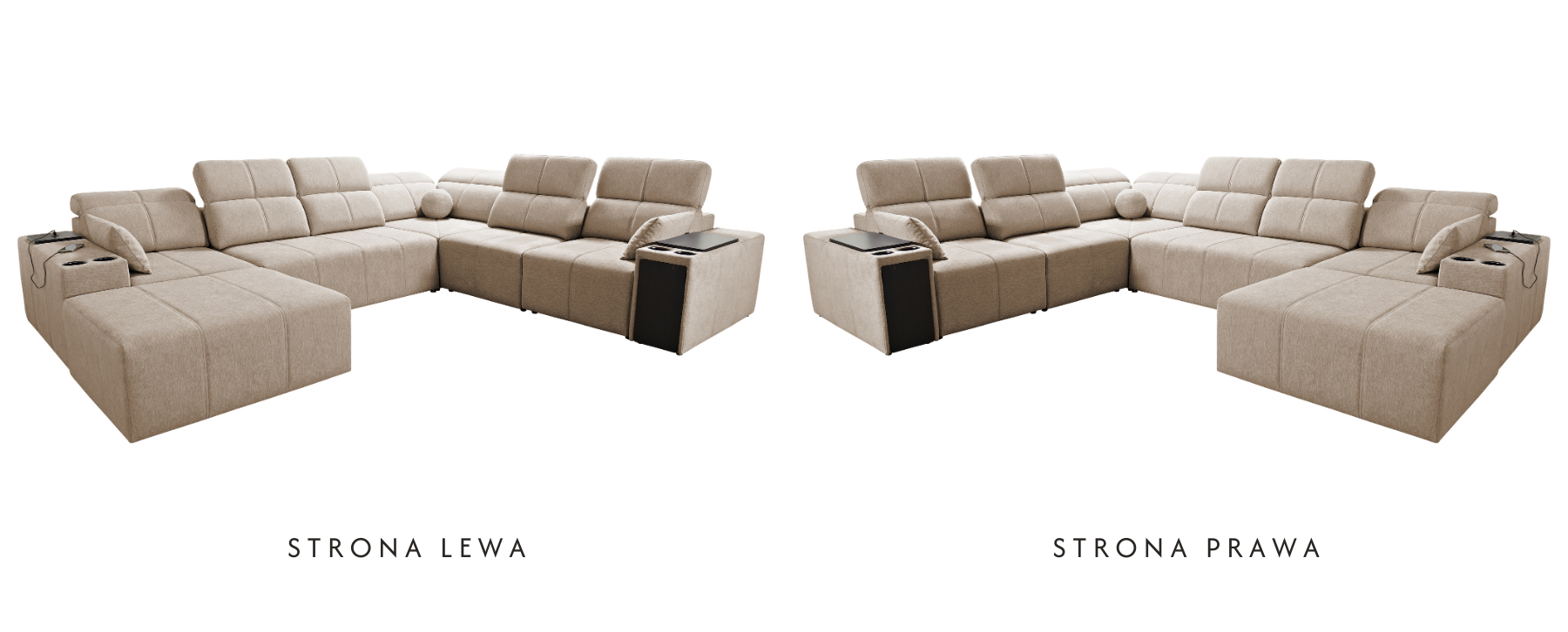 - Narożnik z funkcjonalnym szezlongiem – pufa na zaczepy „krokodylki” pozwala stworzyć leżankę lub służy jako osobne siedzisko, z możliwością schowania zaczepów pod mebel