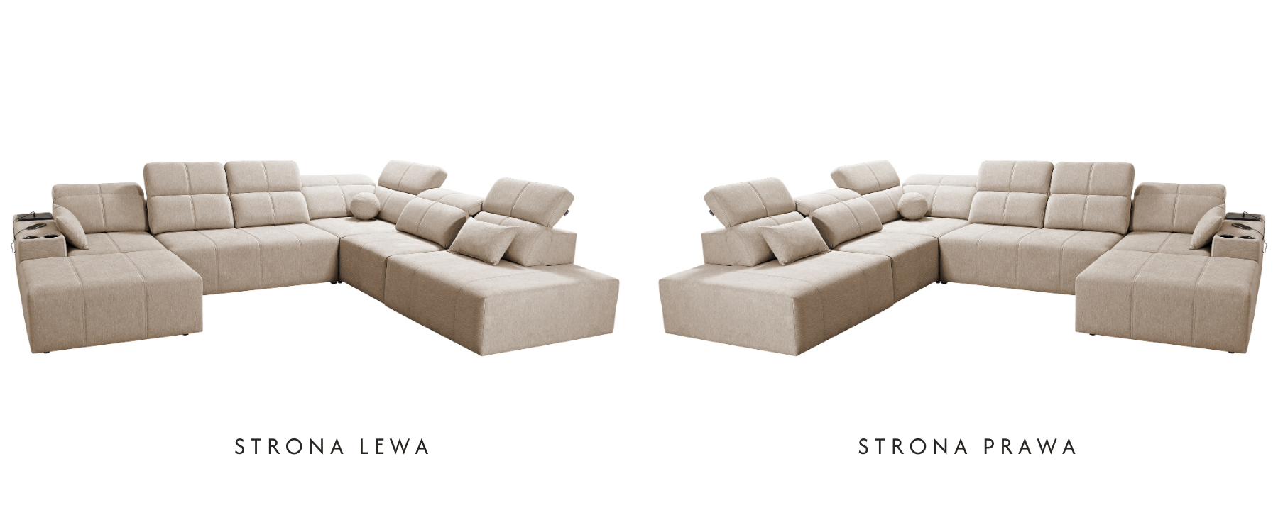 - Narożnik z funkcjonalnym szezlongiem – pufa na zaczepy „krokodylki” pozwala stworzyć leżankę lub służy jako osobne siedzisko, z możliwością schowania zaczepów pod mebel