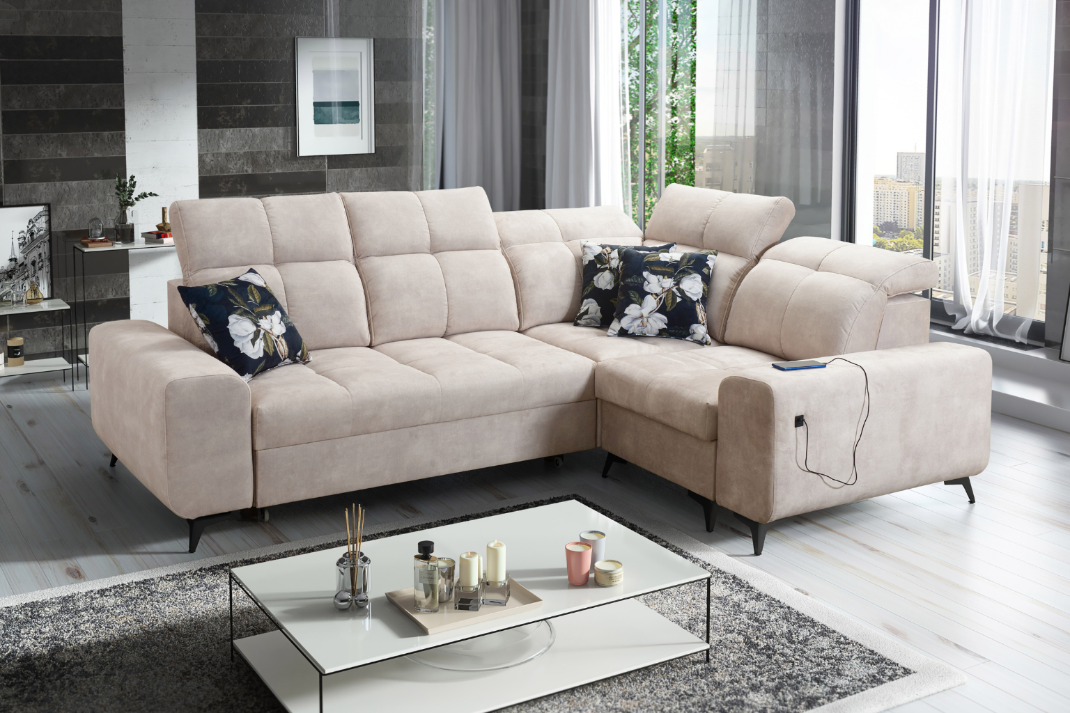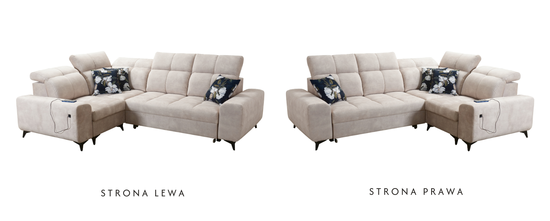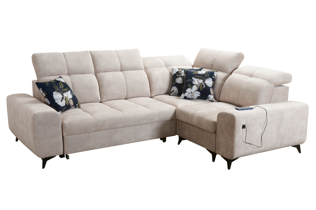Narożnik KIARA II – regulowane zagłówki + port USB + GRATIS PODUSZKI – 266×173 cm