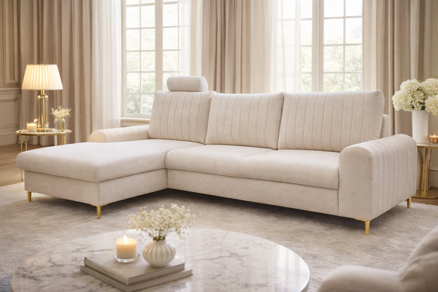 To elegancki mebel z funkcją spania, pojemnikiem na pościel, wysokimi złotymi nóżkami oraz wyjmowanym zagłówkiem, który zapewnia wygodę i stylowy wygląd. Jego nowoczesny design łączy funkcjonalność z luksusowym akcentem, pasując do każdego wnętrza.