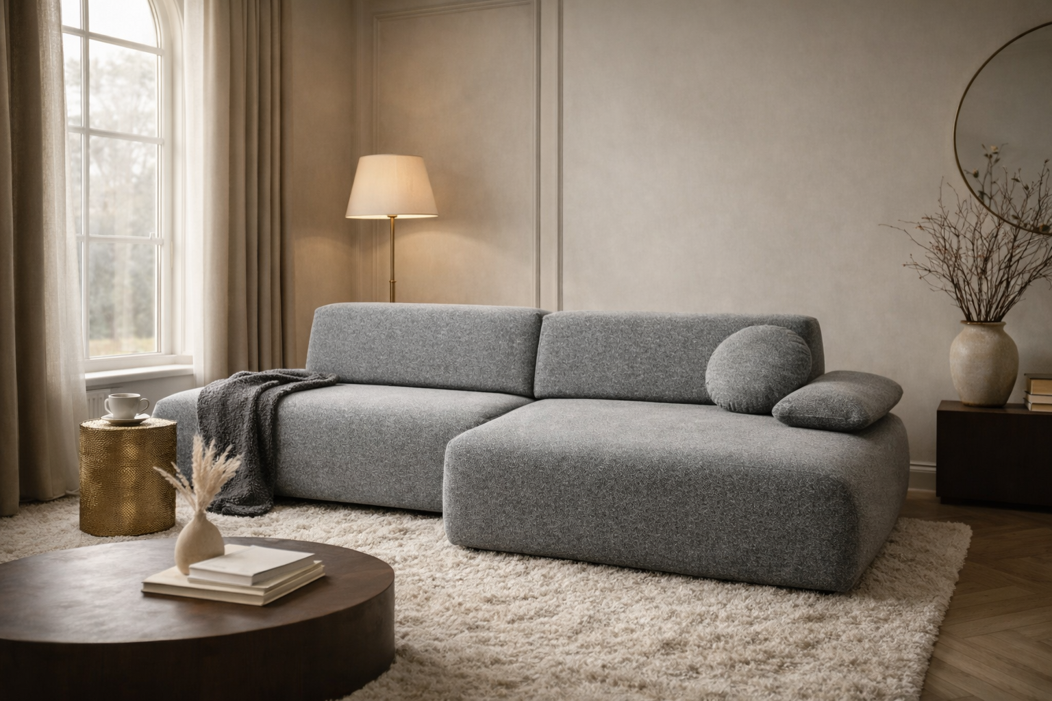 Dzięki minimalistycznej formie narożnik z łatwością wpisuje się w różnorodne aranżacje wnętrz. Prosta, geometryczna konstrukcja została delikatnie złagodzona zaokrąglonymi krawędziami, co nadaje meblowi subtelny, lekki charakter i wyjątkową elegancję.