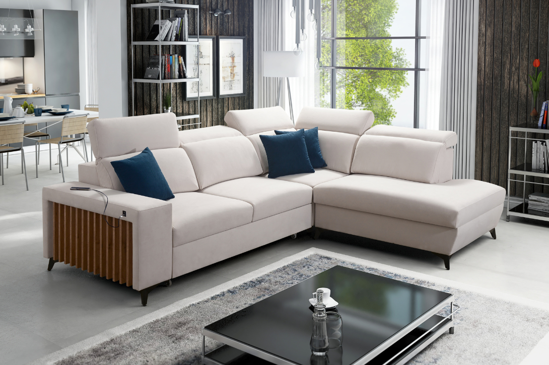 Mebel bardzo wysokiej klasy, który doskonale uzupełni Twoje wnętrze. Narożnik  łączy w sobie nowoczesny design i funkcjonalność, oferując szereg praktycznych udogodnień.